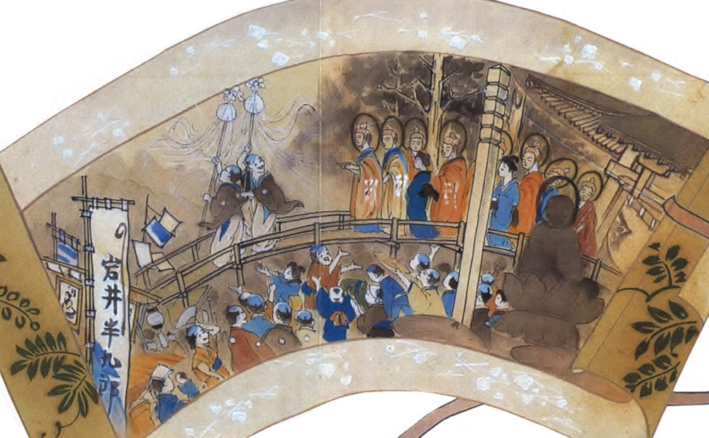 (本堂)へ懸橋がかかり、その橋を信者の方々が